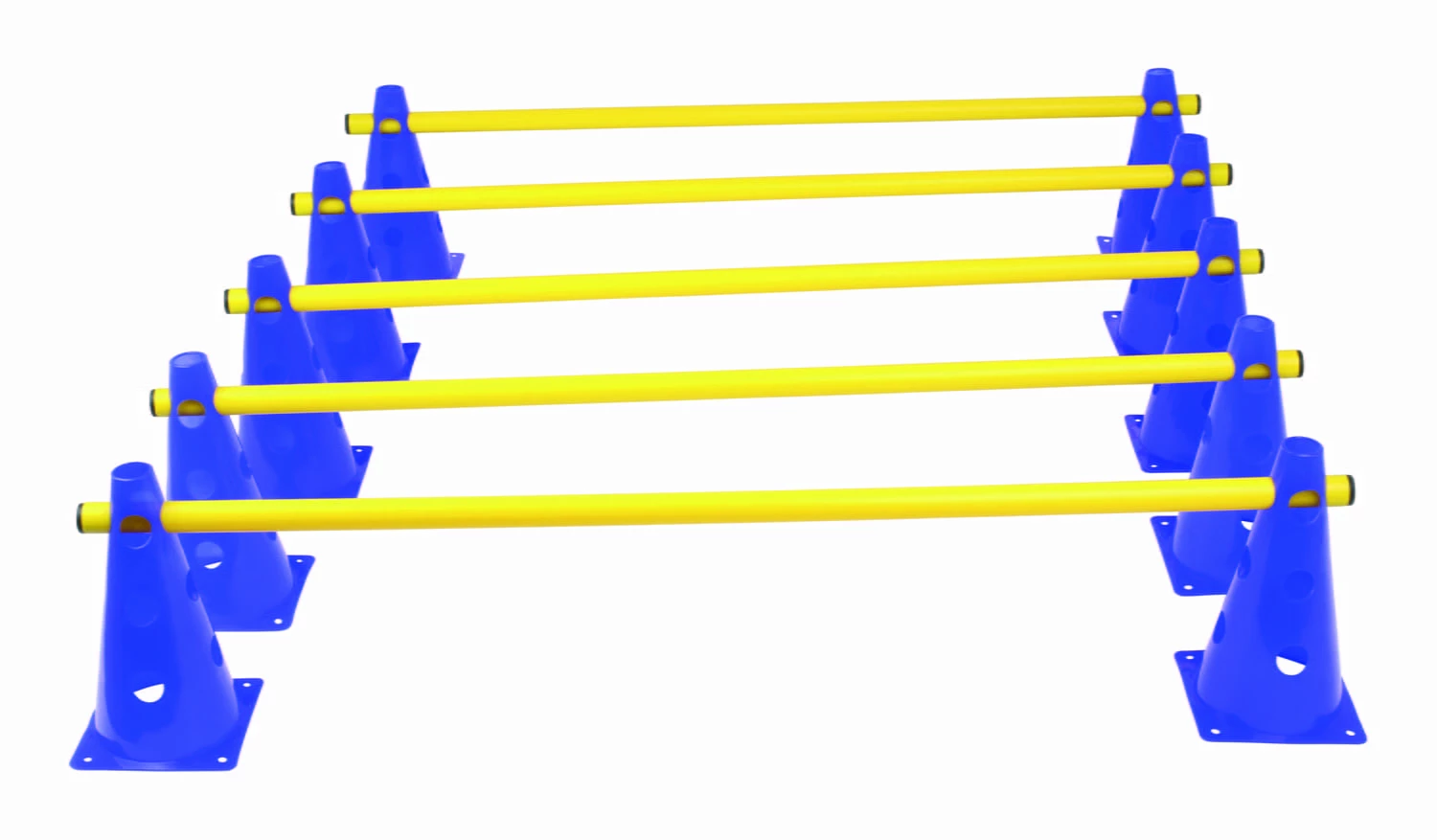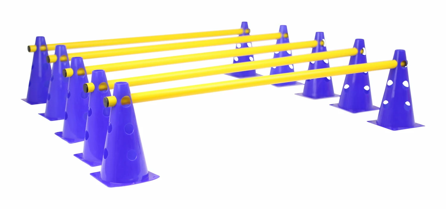 Das Set besteht aus 10 Hütchen (blau) und 5 Stangen (gelb).