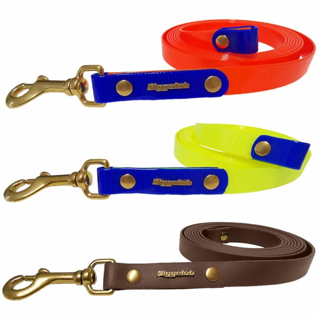 Niggeloh Biothane Schlepp- und Ausbildungsleine GLOSSY orange / gelb ist aus einem hochwertigen BioThane® Material der „Gold transluscent“ (glänzend) Kategorie gefertigt. Die Leine ist robust und widerstandsfähig. Es wurde ein solider Karabiner aus Messing verarbeitet.