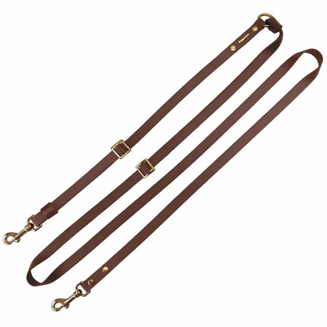 Die Niggeloh Biothane Umhängeleine NOBLE braun ist aus einem mattem, geschmeidigem, original BioThane® Material der„BETA“ Kategorie in geprägter Lederoptik mit hoher Griffigkeit gefertigt. Sie ist doppelt verstellbar bei Umhängeteil und Führleine. Der Karabiner und die anderen Bauelemente sind aus Messing.