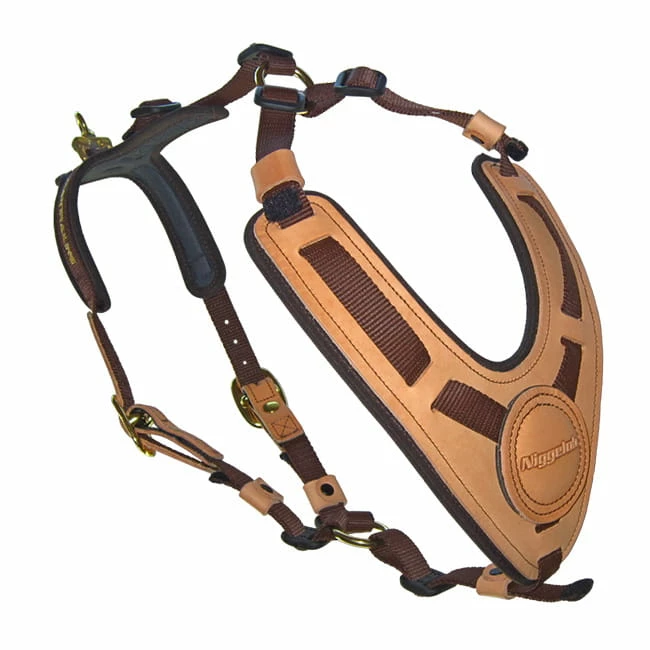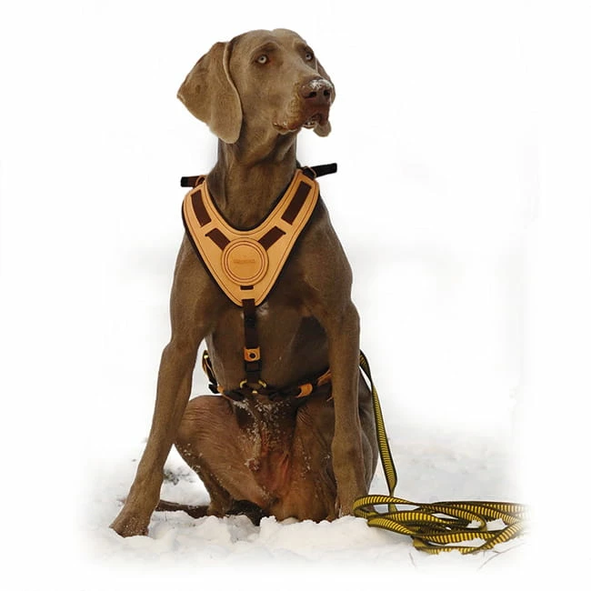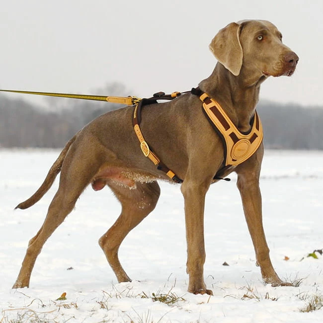 Die verarbeiteten Materialien wie Leder, Neopren und die Messingbeschläge stehen für Wertigkeit und langjährige Nutzung des Geschirrs. Eine maximale Verstellbarkeit im Hals- und Bauchbereich, an den oberen und unteren Stegen, sowie das ergonomisches Design sorgen für eine perfekte Passform am Hund.