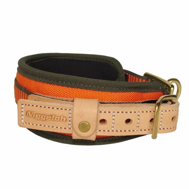 Die Niggeloh-Schweißhalsung ist dank ihrer besonderen Bauform auch für sportliche Hunde interessant. Sie hat eine formstabile Innenlage aus Aluminium. Diese Einlage verhindert, dass sich die Halsung unter Zugbelastung zusammenzieht und die Atmung des Hundes behindert. Eine dicke Neoprenpolsterung innen stellt für den Hund höchsten Tragekomfor sicher. Resistent gegen Verschmutzung, hohe Verschleißfestigkeit & somit lange Lebensdauer.