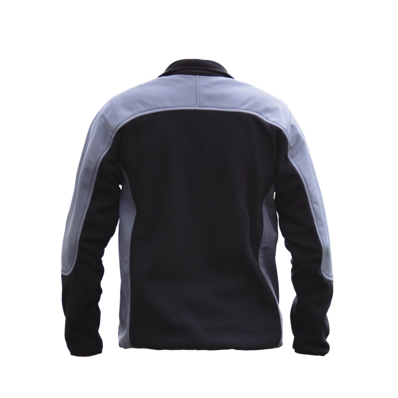 Moderne Fleece Jacke mit Softshell Einsätzen in grau-schwarz mit Sporthund Logo.