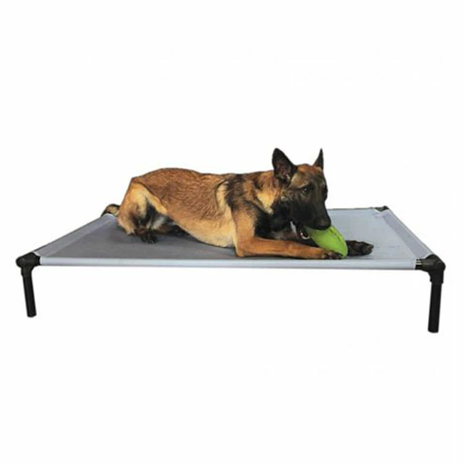 Das robuste Nylonmaterial wird auf den Stahlrahmen aufgespannt. Der Hund liegt – vor Kälte geschützt – leicht erhöht.