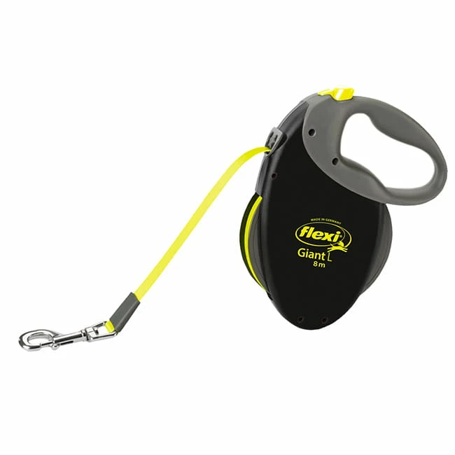 Die Rollleine Giant L von flexi hat einen stabilen Softgriff und Karabinerhaken. Das Gurtband ist Neongelb und daher in der Dunkelheit von Weitem sehr gut zu erkennen. Kein DurchhÀngen der Leine, durch Aufrollautomatik.