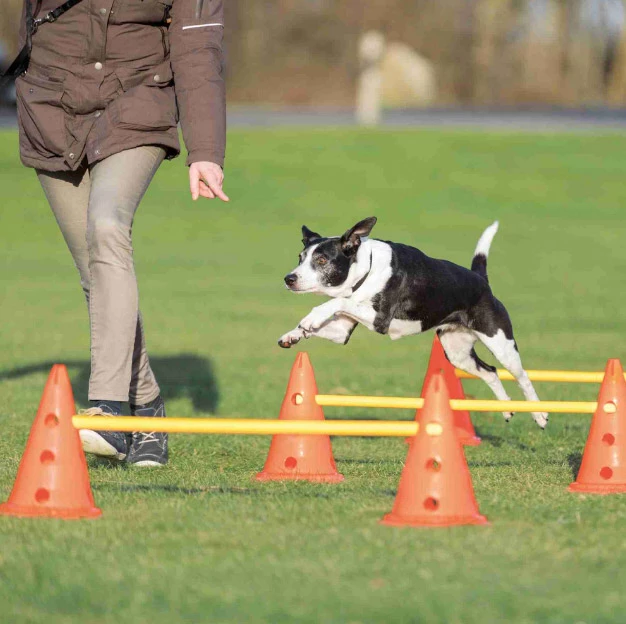Dieses Pylonen-Hindernis-Set hat drei einstellbare Höhen, durch die verschiedene Schwierigkeitsstufen erreicht werden können.