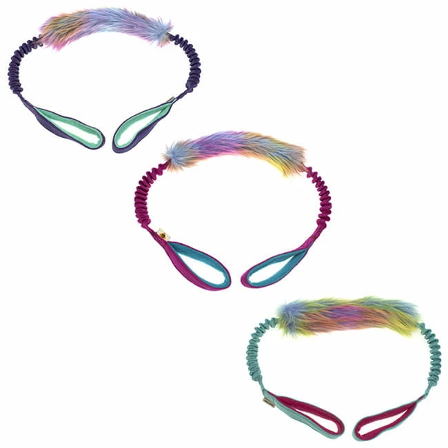 Krabbenförmiges Bestätigungsspielzeug bestehend aus einem kunterbunten Fellteil mit an beiden Enden befestigten Bungee-Seilen mit Handgriffen.